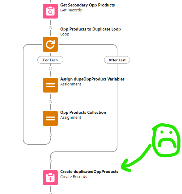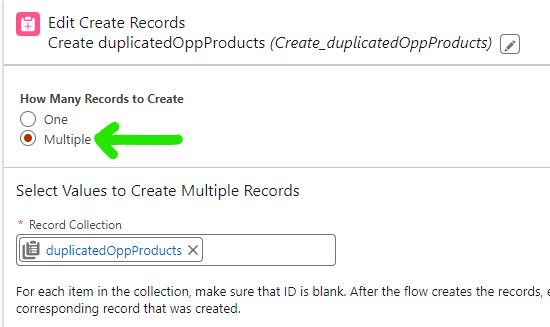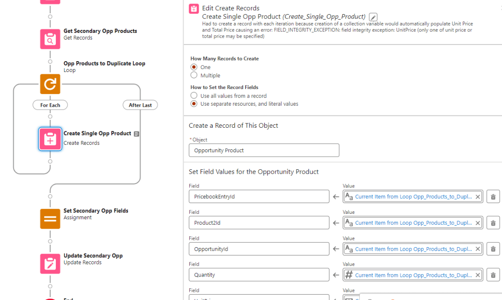 SOLUTION: While not ideal as it is not as efficient, an Opportunity Product record must be created with each loop and the field values assigned in the single record create element. This method restricts the record creation process to apply only what is defined in the Set Field Values for the Opportunity Product section which is critical to ensure Sales Price (UnitPrice) and Total Price are not set at the same time.